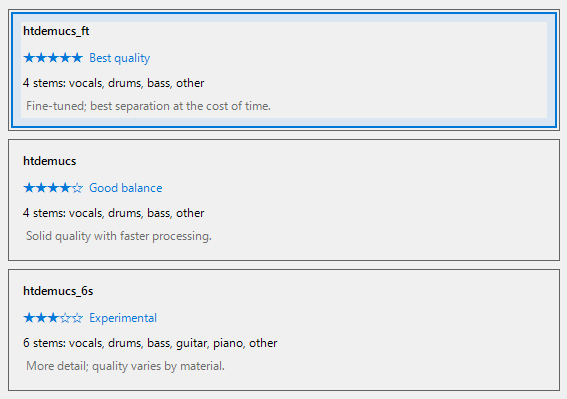 選択したモデルで出力可能な全てのステムに楽曲を分離します。