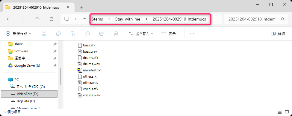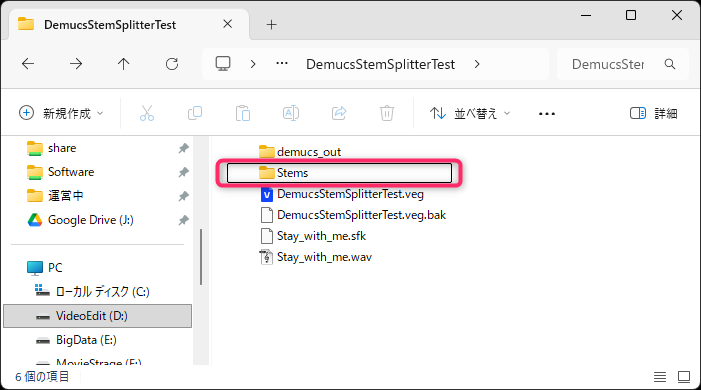 また、プロジェクトフォルダ内に「demucs_out」と「Stems」フォルダが作成され、分離されたオーディオファイルは「Stems」フォルダ内に保存されます。