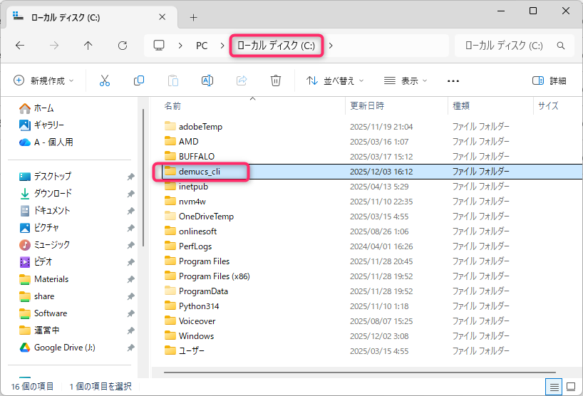 作成されたdemucs_cliフォルダ丸ごとCドライブ直下等わかりやすいフォルダに移動します。今回はCドライブ直下に配置する前提で解説します。