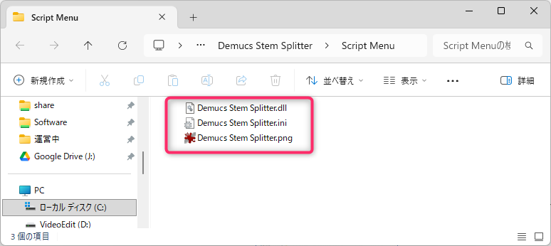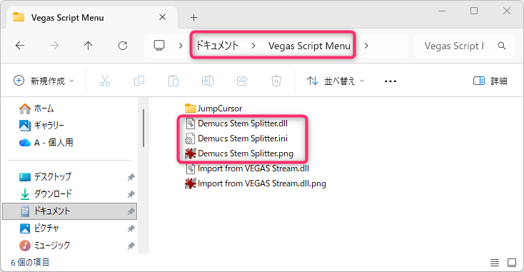 作成された3つのファイル全てを「C:\Users\(ユーザー名)\Documents\Vegas Script Menu」フォルダに移動します。