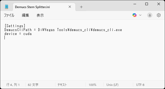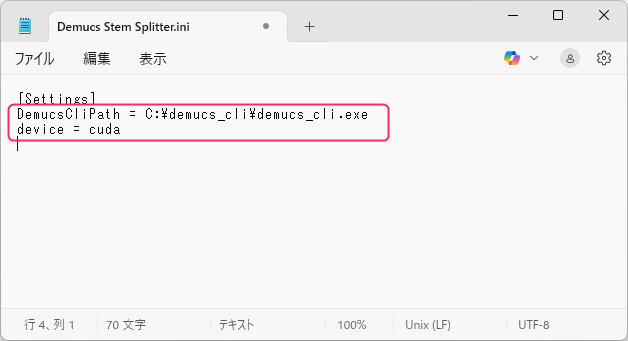 ファイルを移動したら、「Demucs Stem Splitter.ini」をメモ帳などのテキストエディタで開きます。デフォルトは以下の記述になっています。