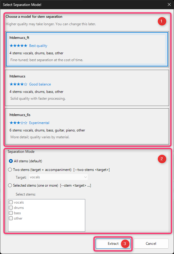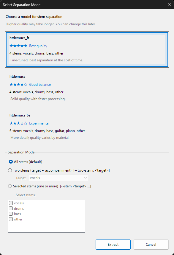 ユーザーが抽出したいステムを自由に指定できるモードです。ボーカルだけ、ドラムだけ、あるいは複数のステムを組み合わせて抽出することも可能です。