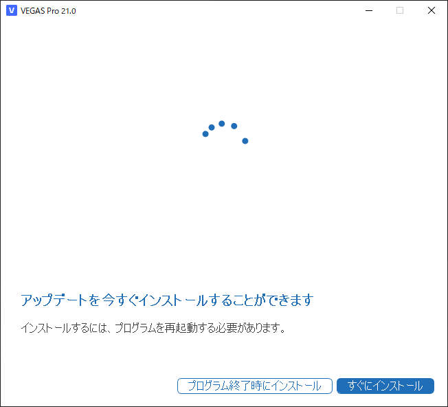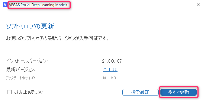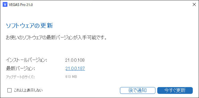 VEGAS Pro 21の更新が存在している場合、起動時に「ソフトウェアの更新」というダイアログが表示され、VEGAS Pro 21向けの更新の存在を知らせてくれます。