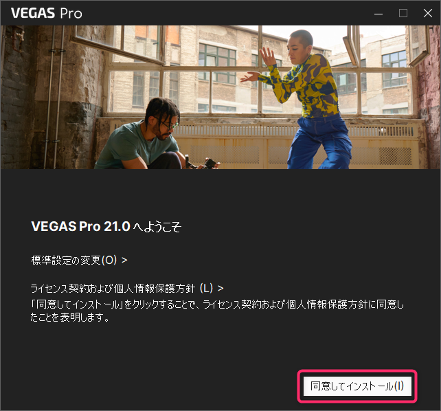 「VEGAS Pro 21.0へようこそ」という画面が表示されるので「同意してインストール」ボタンをクリックします。