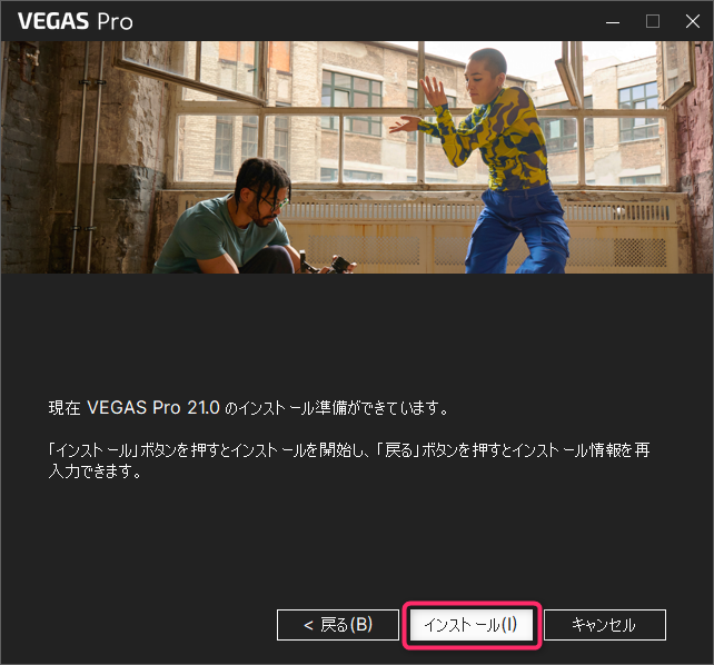 「VEGAS Pro 21.0のインストール準備ができています。」画面が表示されるので「インストール」ボタンをクリックします。