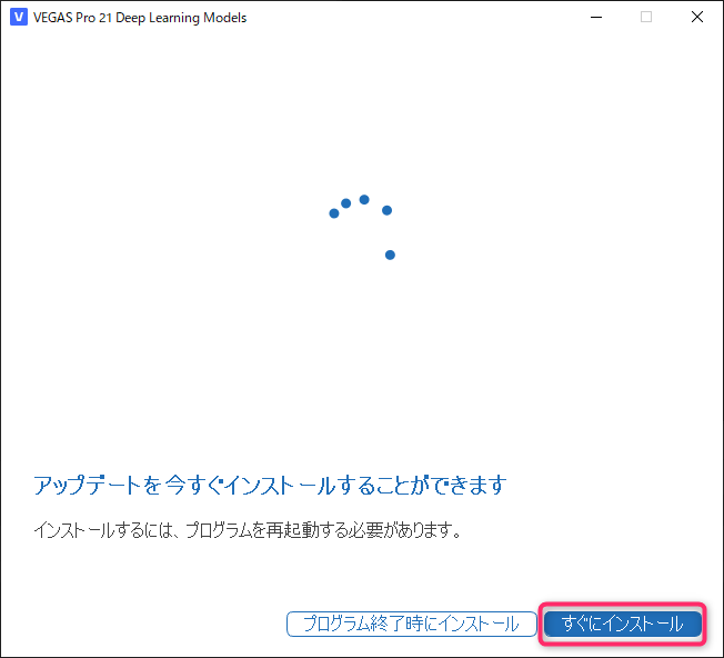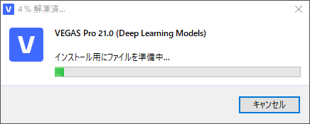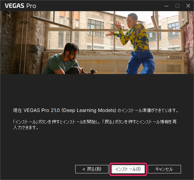 「VEGAS Pro 21.0(Deep Learning Models)のインストール準備ができています。」画面が表示されるので「インストール」ボタンをクリックします。