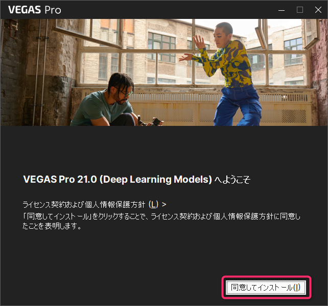 「VEGAS Pro 21.0(Deep Learning Models)へようこそ」という画面が表示されるので「同意してインストール」ボタンをクリックします。