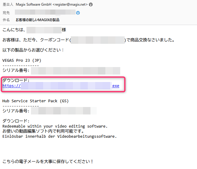 MAGIXアカウントに登録しているメールアドレス宛に「お客様の新しいMAGIXの製品」というタイトルのメールが送信されているはずです。