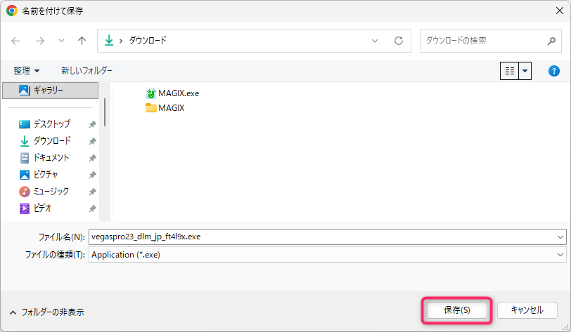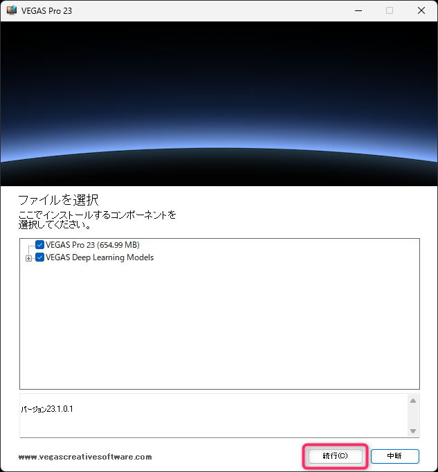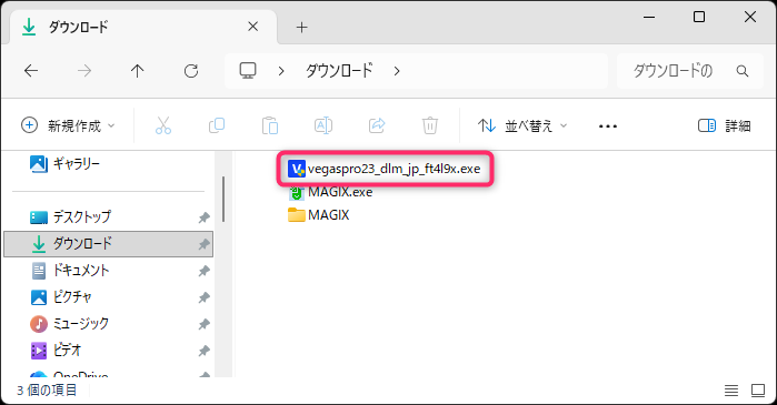 ダウンロードした「vegaspro23」から始まるexeファイルをダブルクリックして実行します。