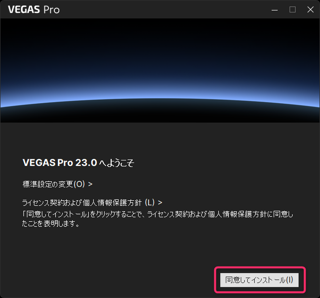 しばらくすると、VEGAS Pro 23.0へようこそという画面が表示されるので「同意してインストール」ボタンをクリックします。