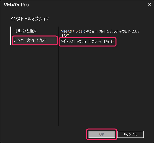 VEGAS Pro 23.0へようこそ画面で「標準設定の変更」をクリックし、インストールオプションから「デスクトップショートカット」を選択。右側の「デスクトップショートカットを作成」にチェックを入れて「OK」ボタンをクリックします。