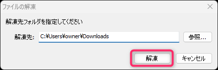 ファイルの解凍先を聞かれるので、解凍先フォルダを指定後「解凍」ボタンをクリックします。