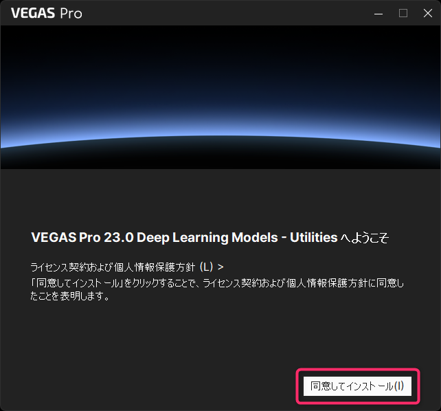 「VEGAS Pro 23.0(Deep Learning Models – Utilities)へようこそ」という画面が表示されるので「同意してインストール」ボタンをクリックします。