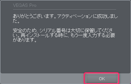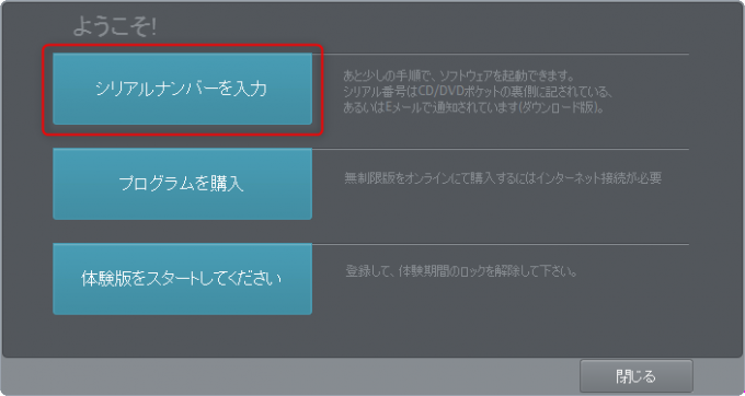 始めてVEGAS Proを利用される方は以下の画面が表示されるので「シリアルナンバーを入力」ボタンをクリックします。