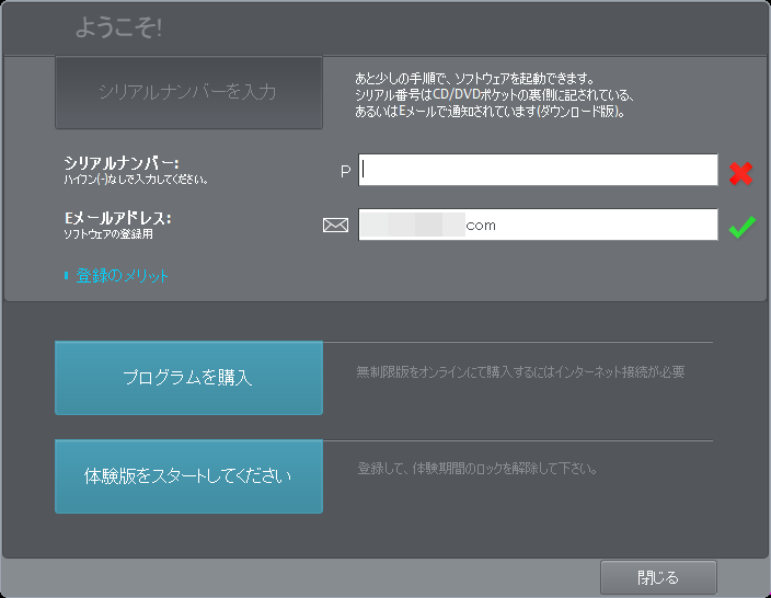 シリアルナンバーとEメールアドレスの入力欄が表示されるので、Pから始まるシリアル番号とMAGIXアカウントに登録しているメールアドレスを入力します。
