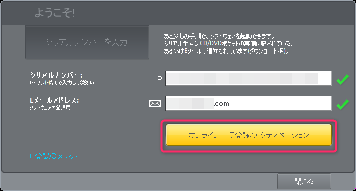 両方入力すると、以下の画面になるので「オンラインにて登録/アクティベーション」ボタンをクリックします。