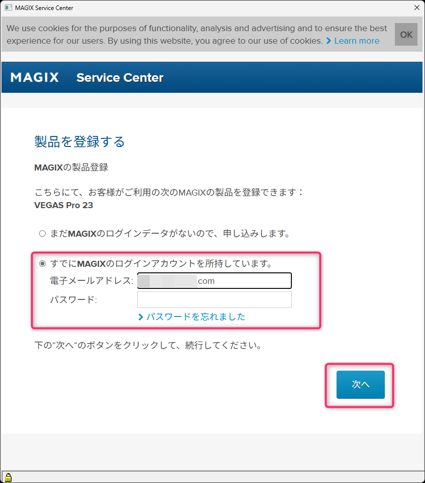 「MAGIX Service Center」という画面が表示されるので、「すでにMAGIXのログインアカウントを所持しています。」を選択し、MAGIXアカウントのログイン情報を入力して「次へ」ボタンをクリックします。