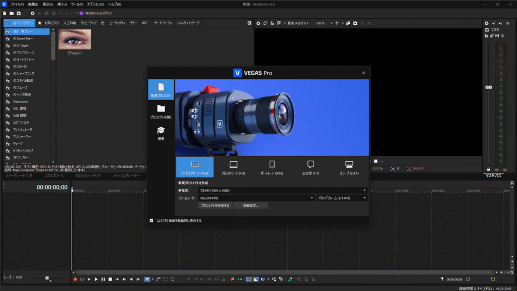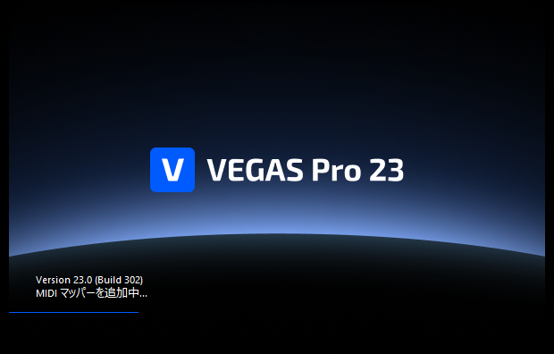 「OK」ボタンをクリックするとVEGAS Pro 23が自動的に起動し、以下のスプラッシュウィンドウが表示されます。