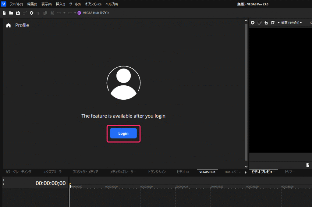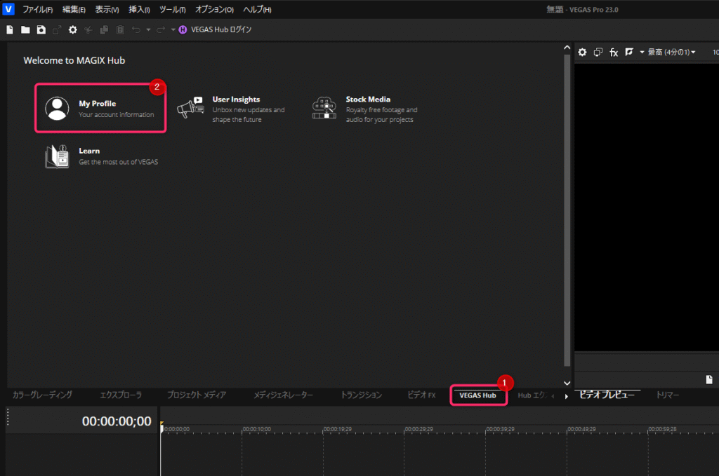 VEGAS Pro 23の「VEGAS Hub」タブをクリックし、My Profileをクリックします。