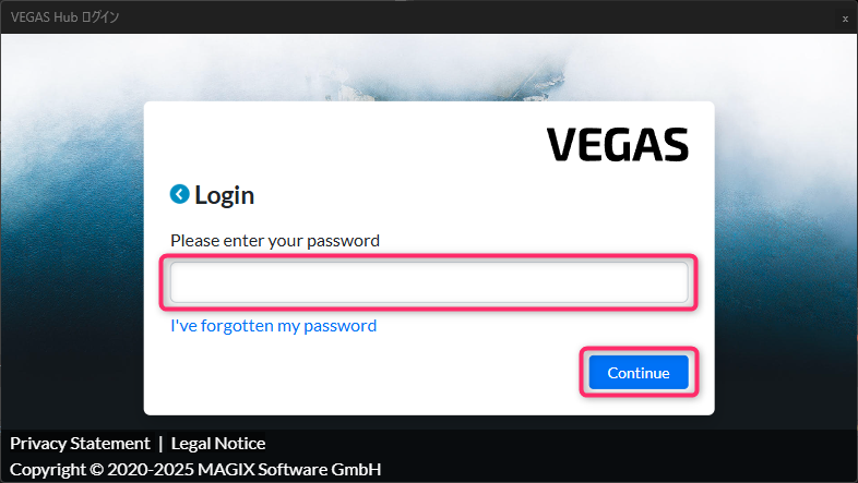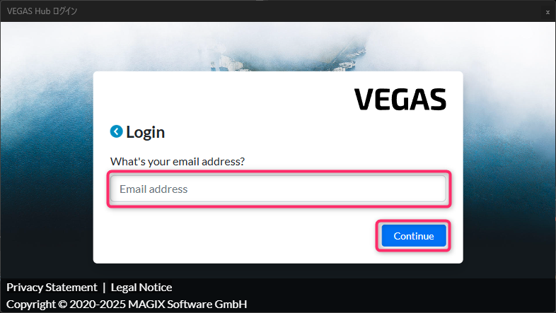 VEGAS Hubログイン画面が表示されるので、Magixアカウントのメールアドレスを入力し、[Continue]ボタンをクリックします。