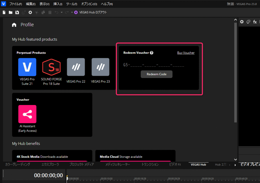 Hub Service Starter PackのアクティベーションはVEGAS Pro 23アプリ上で行います。