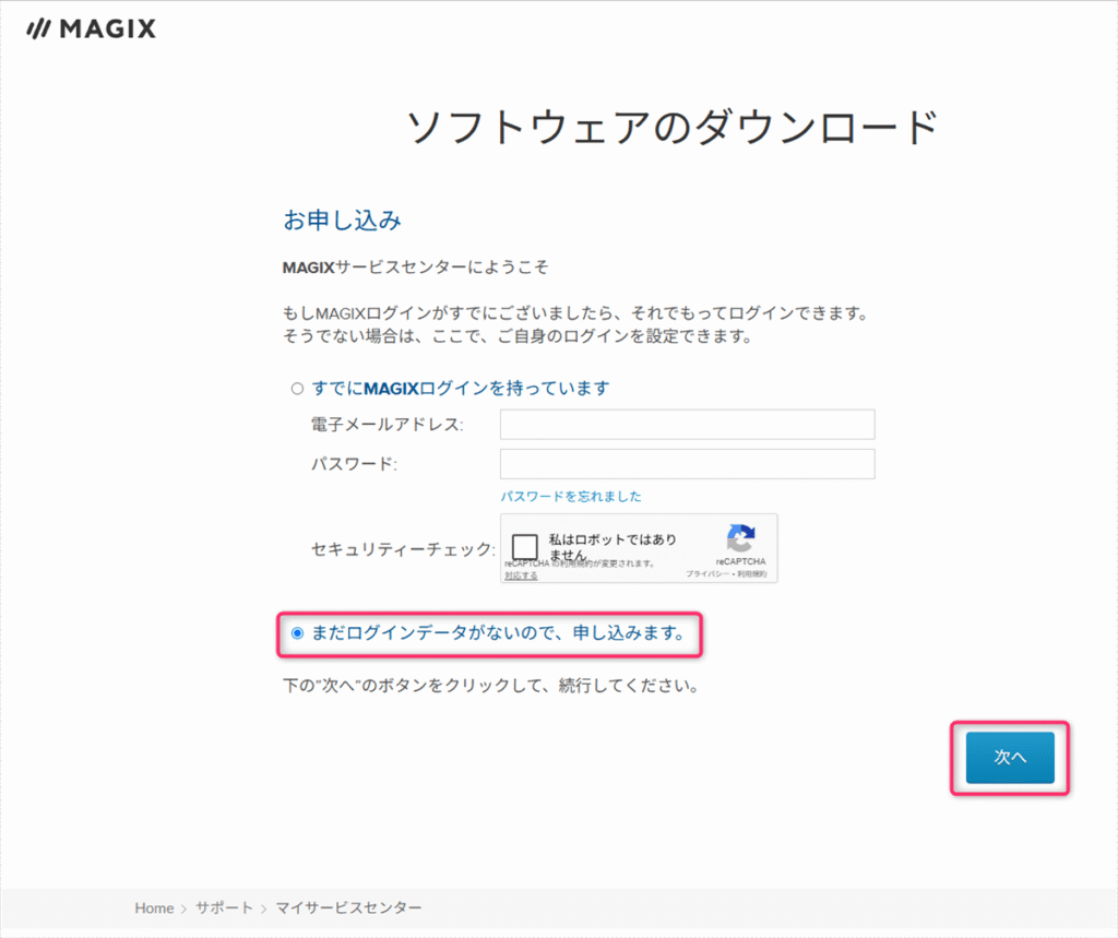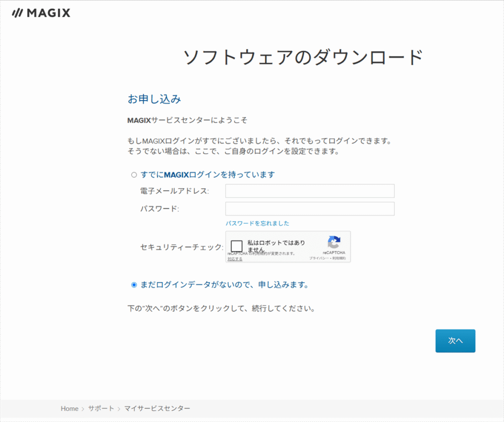 MAGIXアカウントを持っていない方は、「ソフトウェアのダウンロード」画面で、「まだログインデータがないので、申し込みます。]を選択し[次へ]ボタンをクリックします。