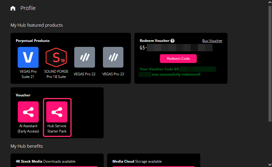 成功すると「Your Voucher Code G5-XXX… was successfully redeemed!」と表示され、Voucher欄に「Hub Service Starter Pack」が表示されます。