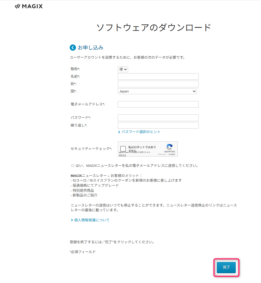すると、以下の個人情報を入力する画面が表示されるので、*マークのついているフィールド全てに必要事項を入力し、セキュリティ―チェックのチェックボックスにチェックを入れて「完了」ボタンをクリックします。