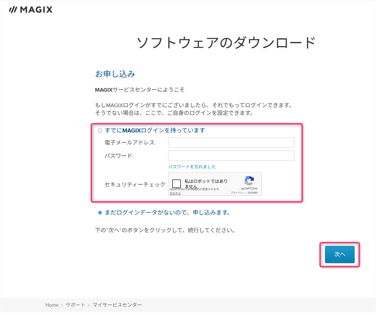 すでにMAGIXアカウントを持っている方は、「すでにMAGIXログインを持っています」を選択し、ログイン情報を入力してセキュリティチェックのチェックボックスにチェックを入れ「次へ」ボタンをクリックします。