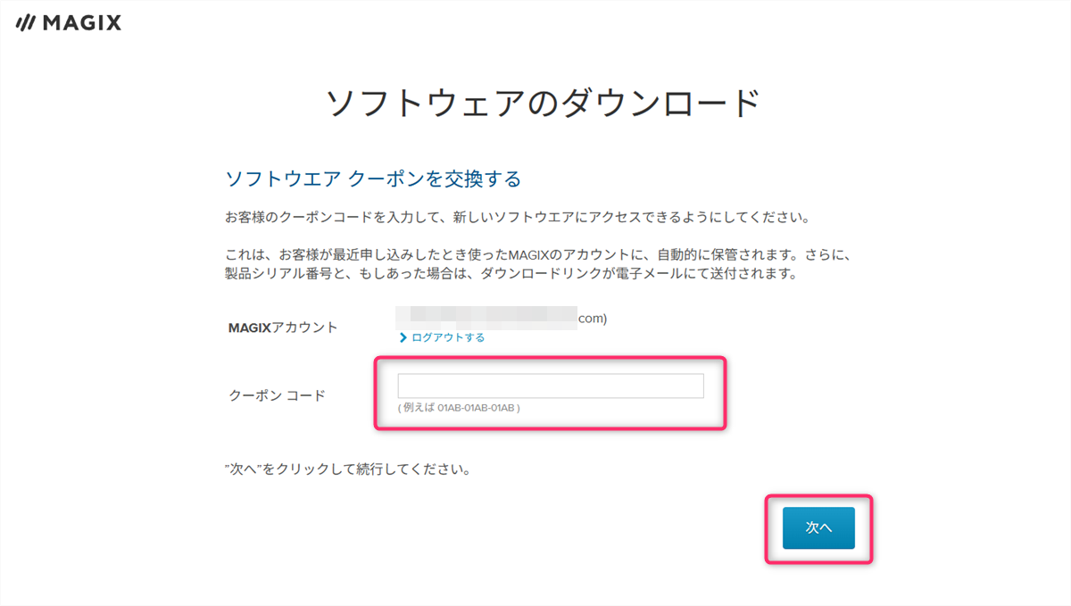 「ソフトウェア クーポンを交換する」という画面が表示されるので、「クーポンコード」を入力し、「次へ」をクリックします。